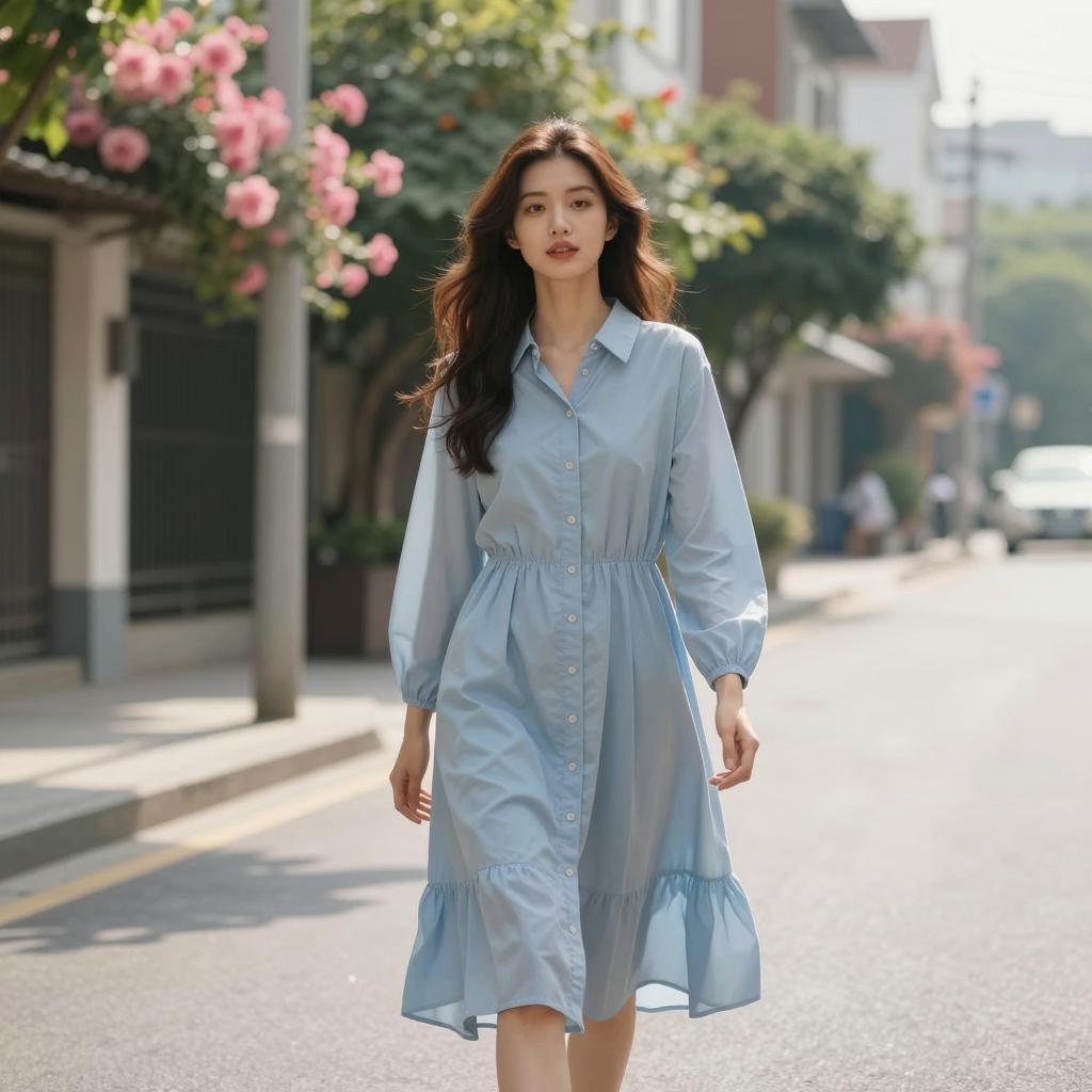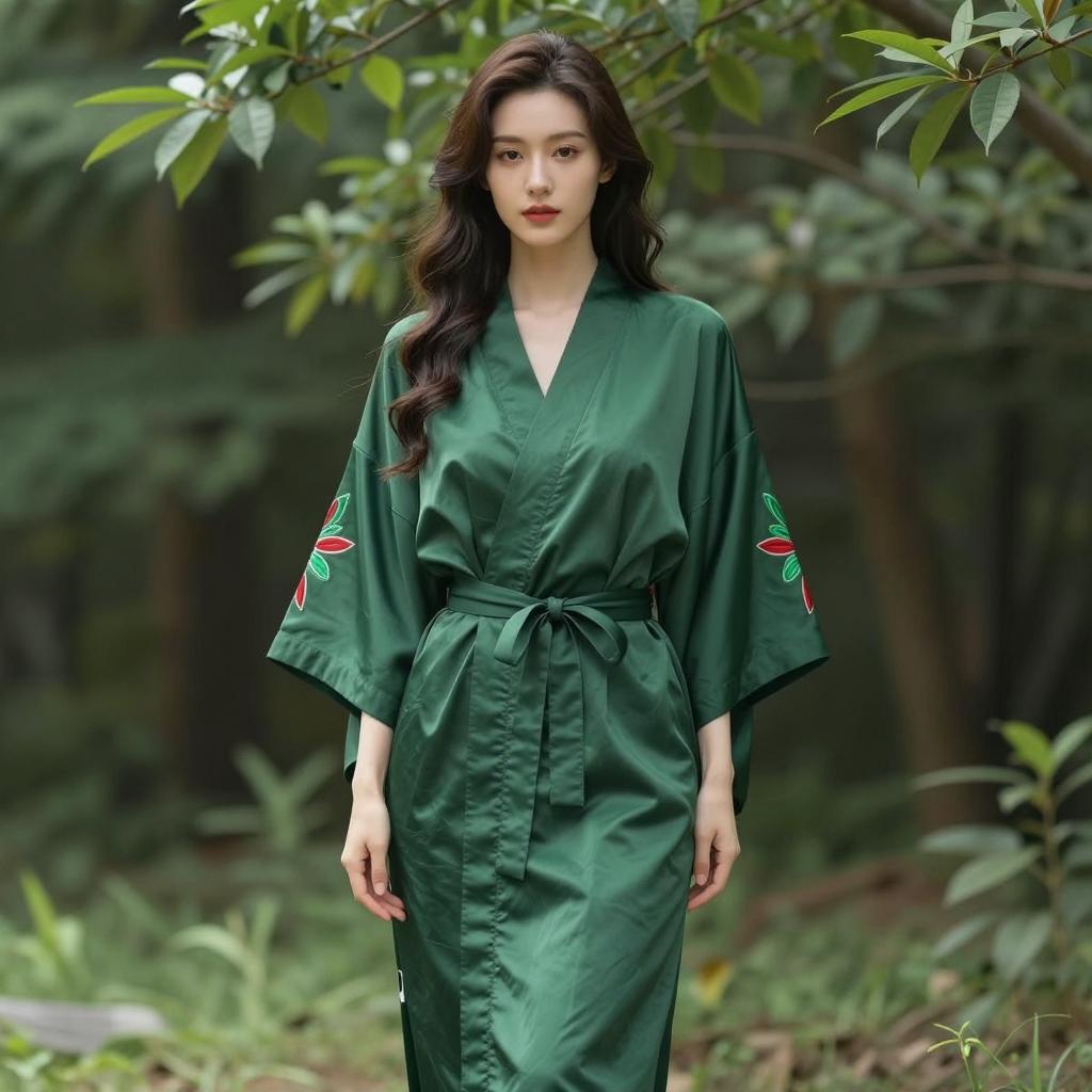 Green robe costume, photorealistic, female model, green silk kimono, long wavy brown hair, green forest background, daylight, natural light, standing, looking at camera, kimono with red and green embroidered patterns on sleeves, loose robe style, tied at waist, serene expression, lush greenery, leafy trees, blurred background, realistic ures, slight bokeh effect, full body shot, casual elegance, summer vibe, outdoor setting, soft shadows, no makeup