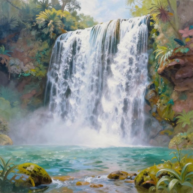 Vibrant digital painting of a cascading waterfall amidst lush, green tropical foliage, with clear turquoise water below and mist rising.