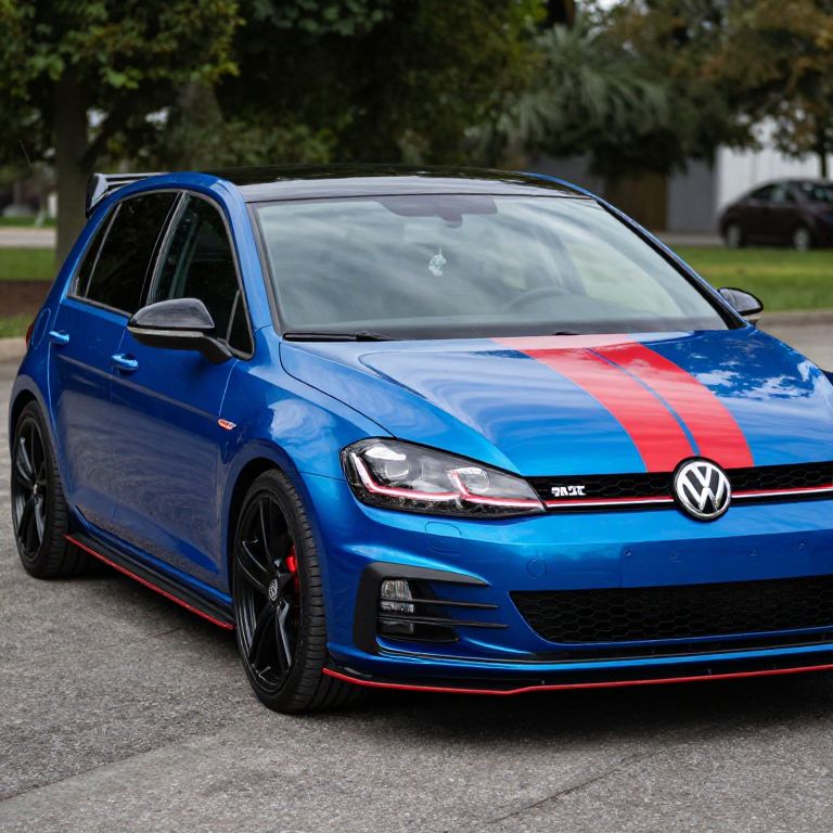 Vividly painted Volkswagen MK7 GTI ECS tuning showcased outdoors, featuring a striking blue exterior, black wheels, and a bold red stripe accentuating its aggressive front grille design.