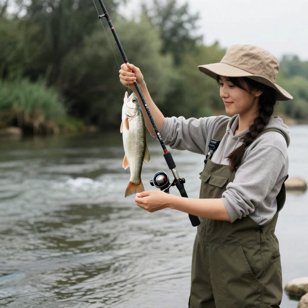 Woman Fishing in River Scene