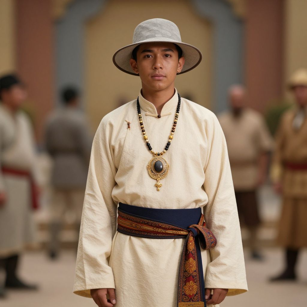 This photograph depicts a young boy standing in a courtyard, wearing traditional attire. He has a medium-brown complexion and short black hair. He is dressed in a cream-colored, long-sleeved tunic with a black sash wrapped around his waist, adorned with an intricate pattern. A large, oval, blue gemstone pendant hangs from a black beaded necklace around his neck. He also wears a wide-brimmed, light gray hat. In the blurred background, several other people in similar traditional outfits stand, with a building featuring a yellow and blue archway. The image has a vibrant, slightly exaggerated color style, typical of CGI enhancements.
