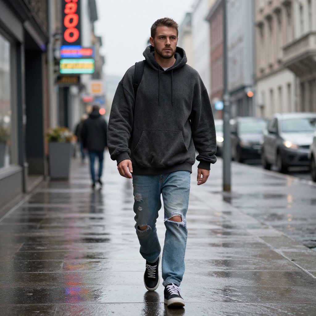 Edgy street looks, european man, in a oversized hoodie and distressed jeans, walking through a rainy european city street with neon signs and puddles, realistic photography style