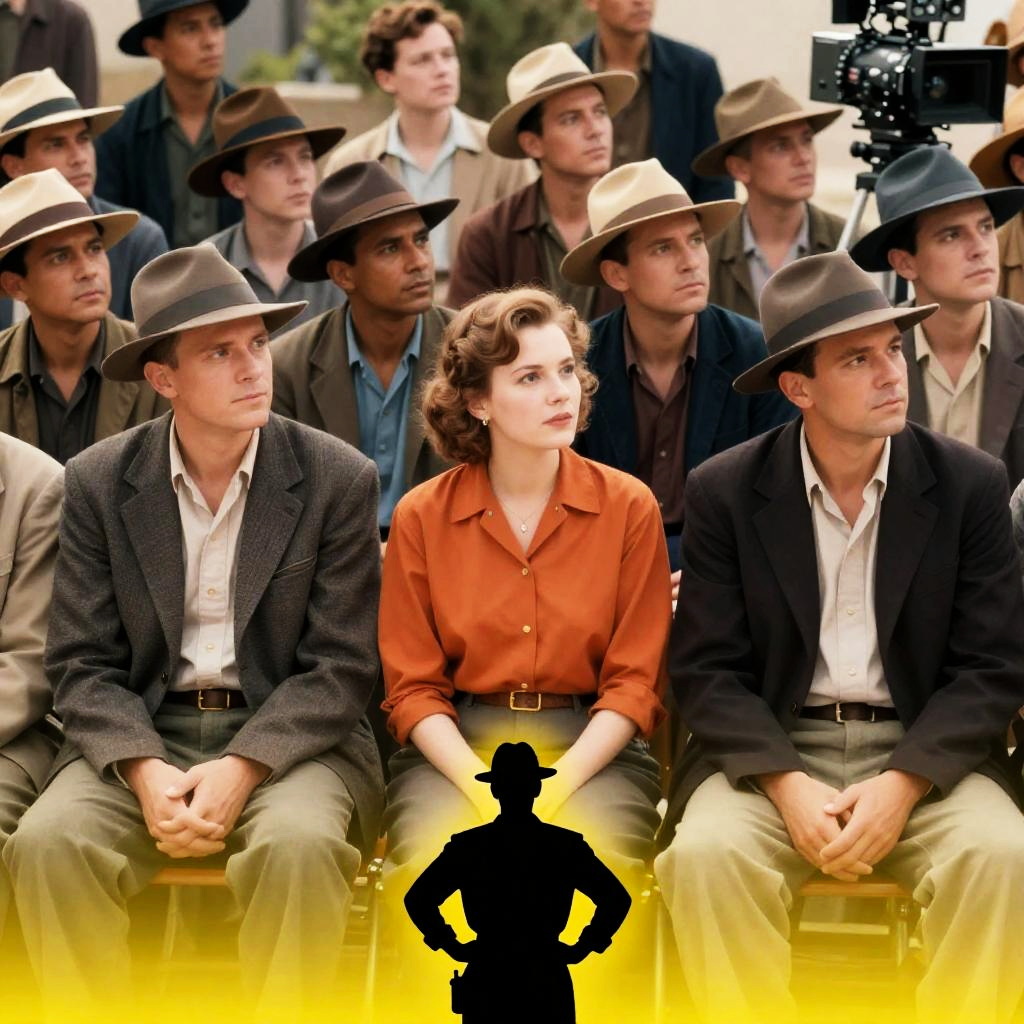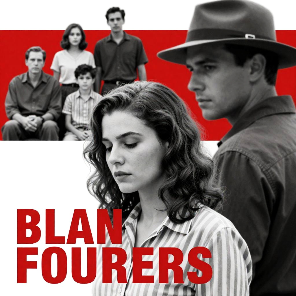 Black-and-white film poster. Woman with wavy hair, downcast expression, wearing striped shirt. Man in wide-brimmed hat, turned away, serious expression. Top left: group in grayscale, seated and standing. Bold red and white background. Movie title in red.