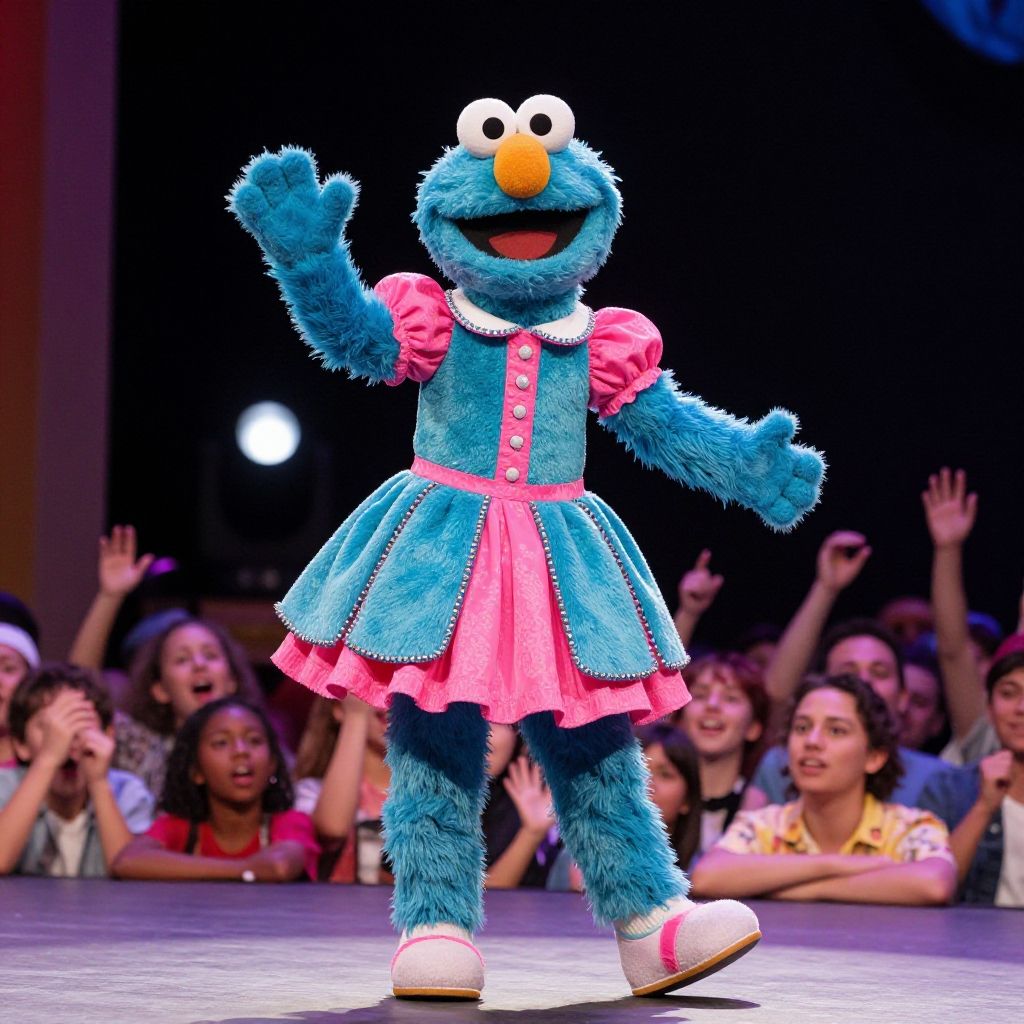 Photograph of blue, furry Elmo-like character in pink and blue dress, waving at cheering audience on stage. Bright theater lights.