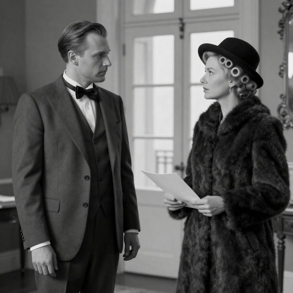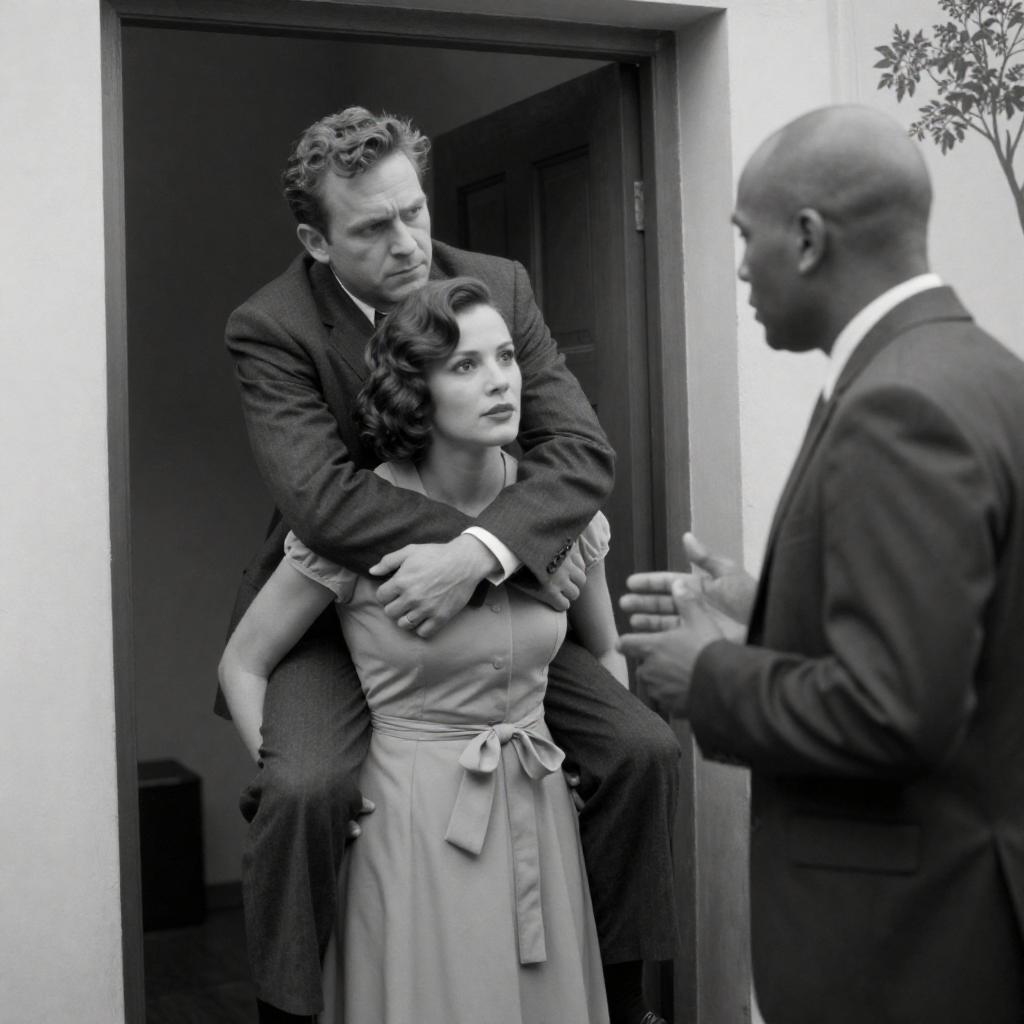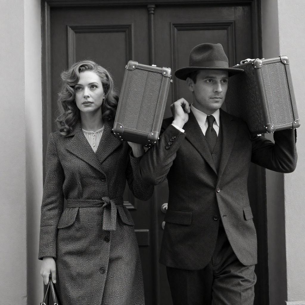 Black and white photograph of a man and woman in a doorway. The man, wearing a dark suit and hat, carries two large, patterned suitcases on his shoulders. The woman, with wavy hair and a patterned coat, looks to her left. Both have neutral expressions. Wooden door in the background. Man's face slightly turned to the right. Woman's face partially turned to the left. Light from the left side casts shadows.