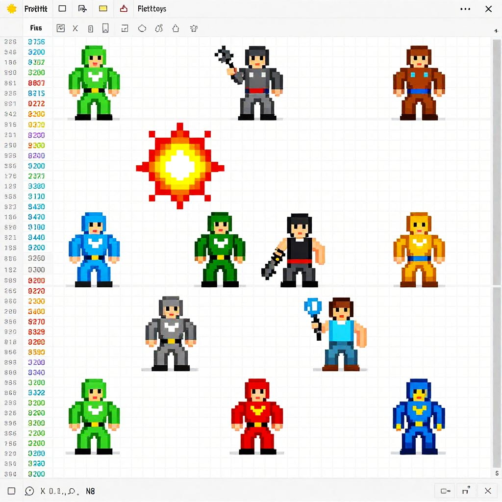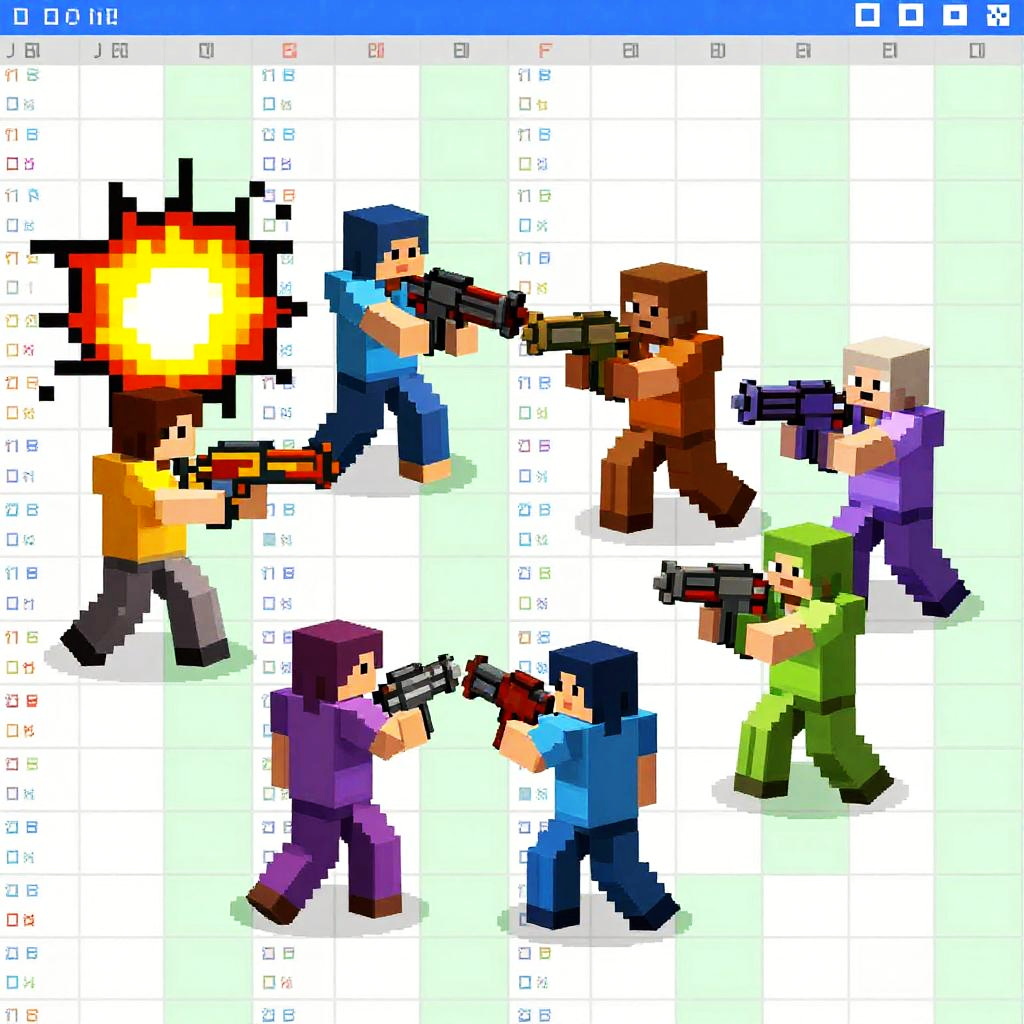 Spreadsheet pixel art Fortnite landscape featuring pixelated trees, forts, and players made from spreadsheet cells with formula symbols, cool pixel animations, grid-based textures, strong 8-bit influence and colorful game-inspired elements in a digital arena.