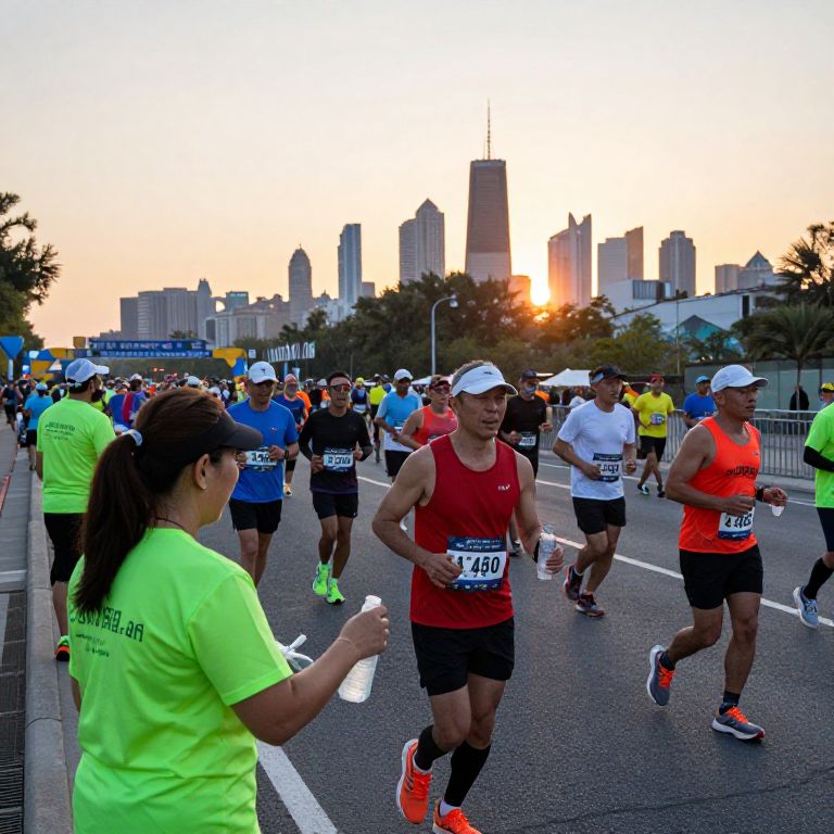 A bustling marathon course with runners of all ages, volunteers handing out water, and a backdrop of a city skyline as the sun sets in the background.