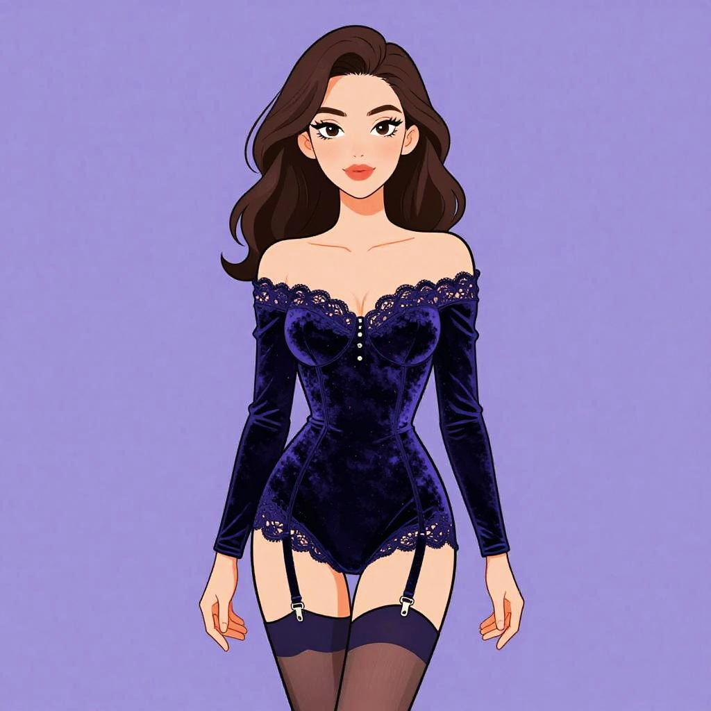 Illustration of a woman with long dark hair and a pretty face wearing a midnight blue velvet bodysuit with off-shoulder design and intricate lace detailing. The fitted bodysuit features long sleeves, snap closure at the crotch, and a subtle sheen. She is also wearing coordinating velvet garter belt and thigh-high stockings, standing against a solid purple background.