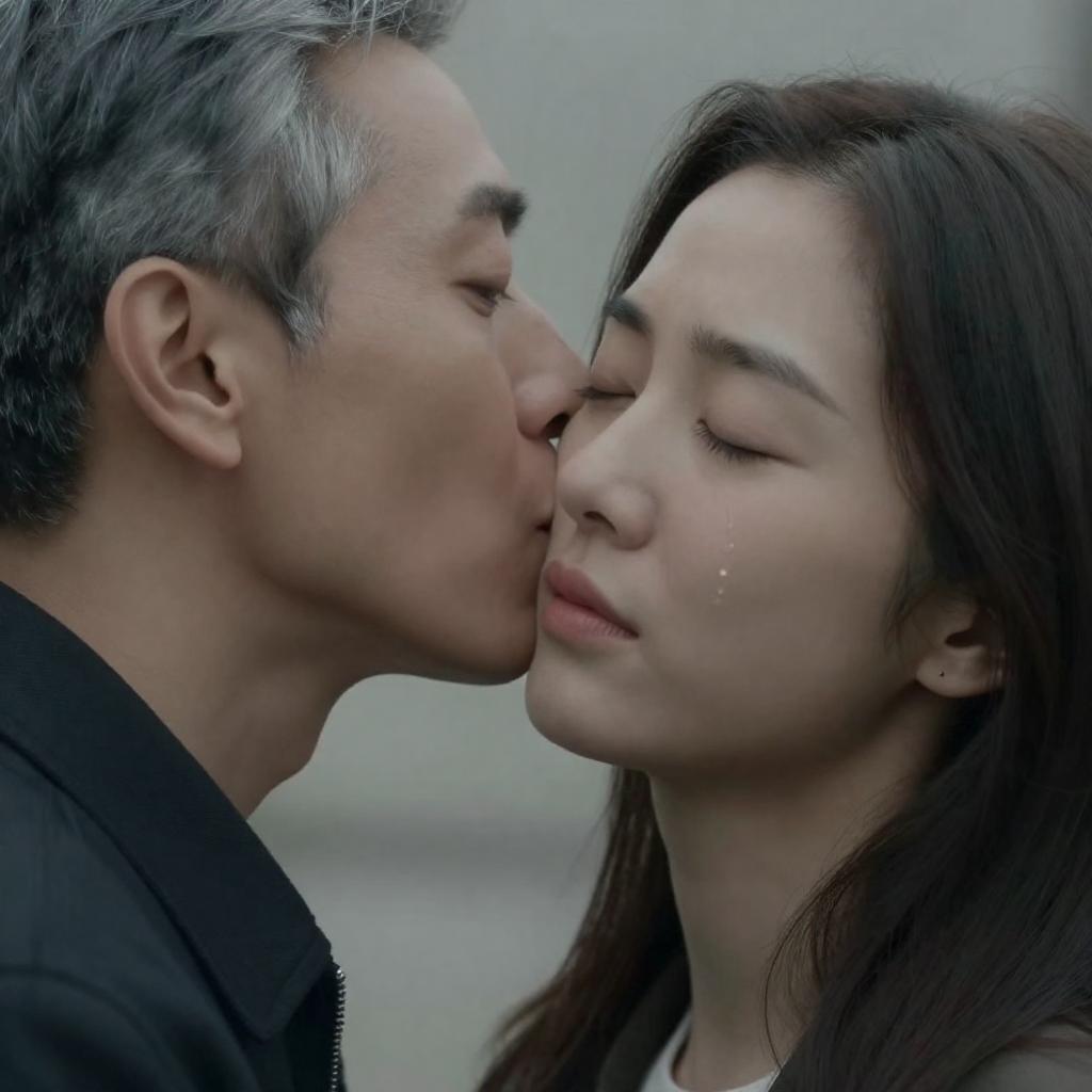 Close-up photograph of a man and woman. Man with gray hair, black jacket, kissing woman's cheek. Woman with closed eyes, long dark hair, light skin, slight drool on her cheek. Intense, passionate moment. Two people.