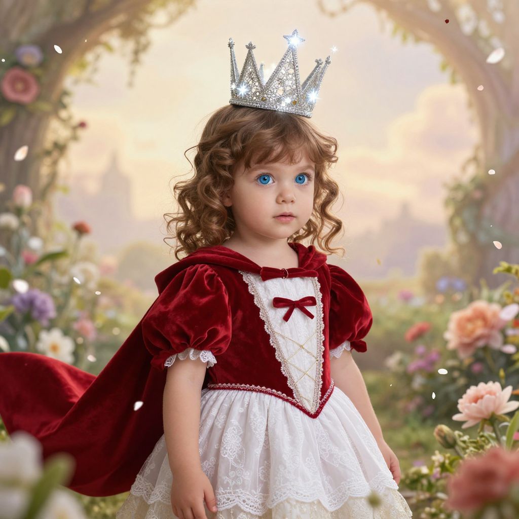 A young child with soft, curly brown hair and big, sparkling blue eyes stands in a magical garden, wearing a beautiful red and white dress with delicate lace trim, a red velvet cape flowing behind them, and a glowing silver crown on their head that sparkles with tiny stars. The background features blooming flowers, floating petals, and a soft golden sunrise, creating a whimsical and enchanting atmosphere.