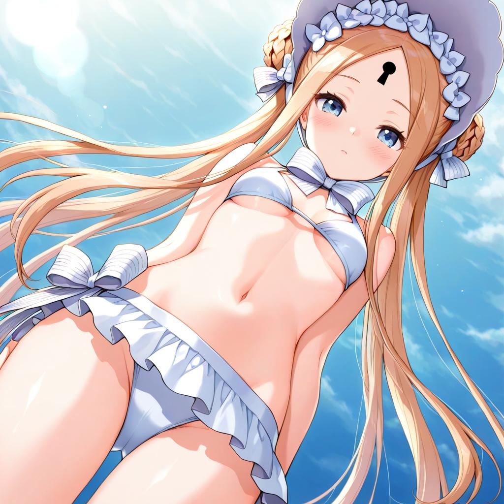 Abigail williams (swimsuit foreigner) (fate), fate (series), 1girl, blue eyes, very long hair, blonde hair, parted bangs, sidelocks, twintails, double bun, hair bow, small breasts, thighs, navel, white headwear, white bikini, bare shoulders, white bow, forehead, bonnet, keyhole, miniskirt, by artist cuteg, illustrious