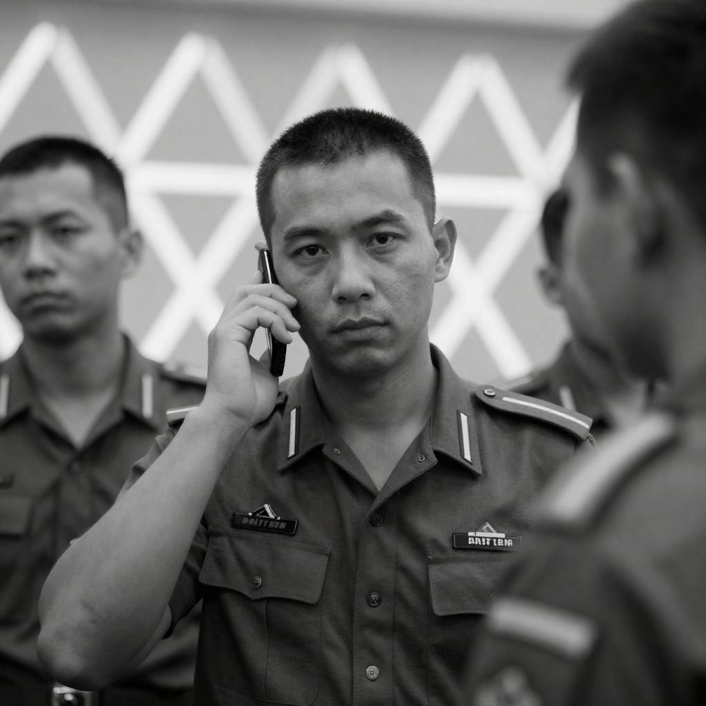 Black-and-white photograph of three men in military uniforms. Central man with short hair, serious expression, holding phone to ear. Background with illuminated pattern. Two other men partially visible, one on left, one on right.