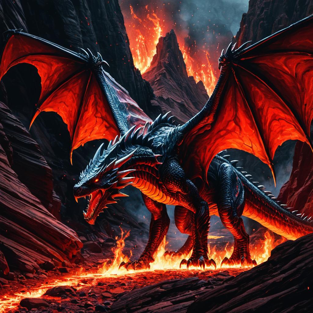 Highly detailed digital artwork of a fire wyvern standing in a blood red canyon surrounded by glowing flames and embers. The wyvern has dark scales with fiery red wings, sharp spikes along its back, and glowing eyes. The background features jagged rock formations with intense fire and lava flows, creating a dramatic and intense fantasy scene.