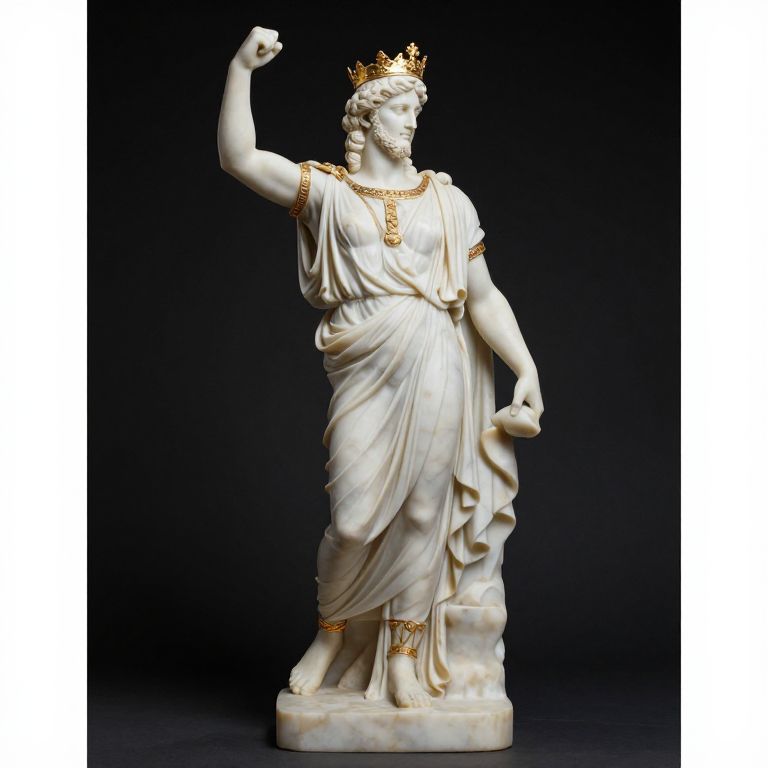 Improvisation marble sculpture photo of greek god full body, wearing luxurious ancient greek clothes, soft light studio, black color background, wearing gold crown. canon camera.,
