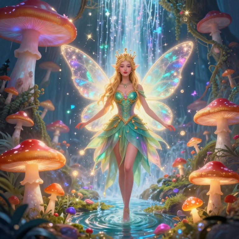 Digital artwork of five fairy-like women in green and yellow leaf dresses, with wings, standing in a moonlit forest, framed in an ornate black