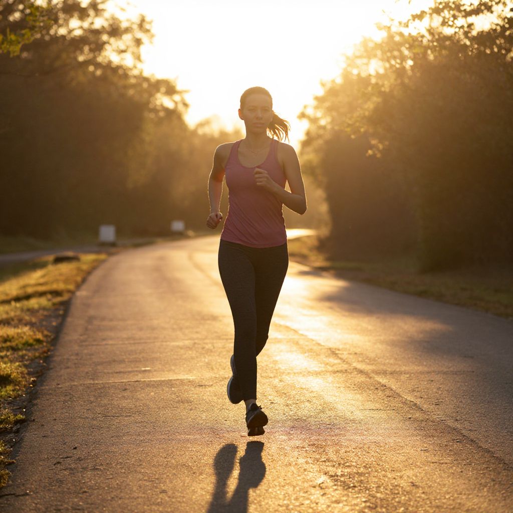 Woman jogging along a sunlit road, her silhouette framed by golden rays as she enjoys the invigorating morning exercise.