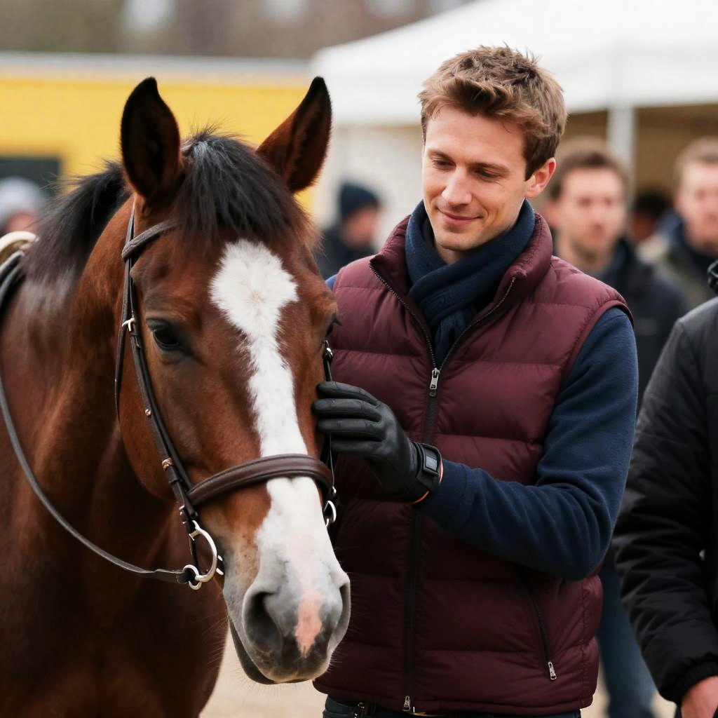 Photograph of a man with short brown hair, wearing a maroon puffy vest, dark blue scarf, and black gloves, standing beside a brown horse with a white stripe on its face. The man is gently patting the horse's head. In the background, blurred people and a yellow structure are visible. Another person’s arm with a black jacket is on the right. The horse wears a brown leather harness. The man smiles slightly, and the horse has a calm expression. Two people are visible in the background.