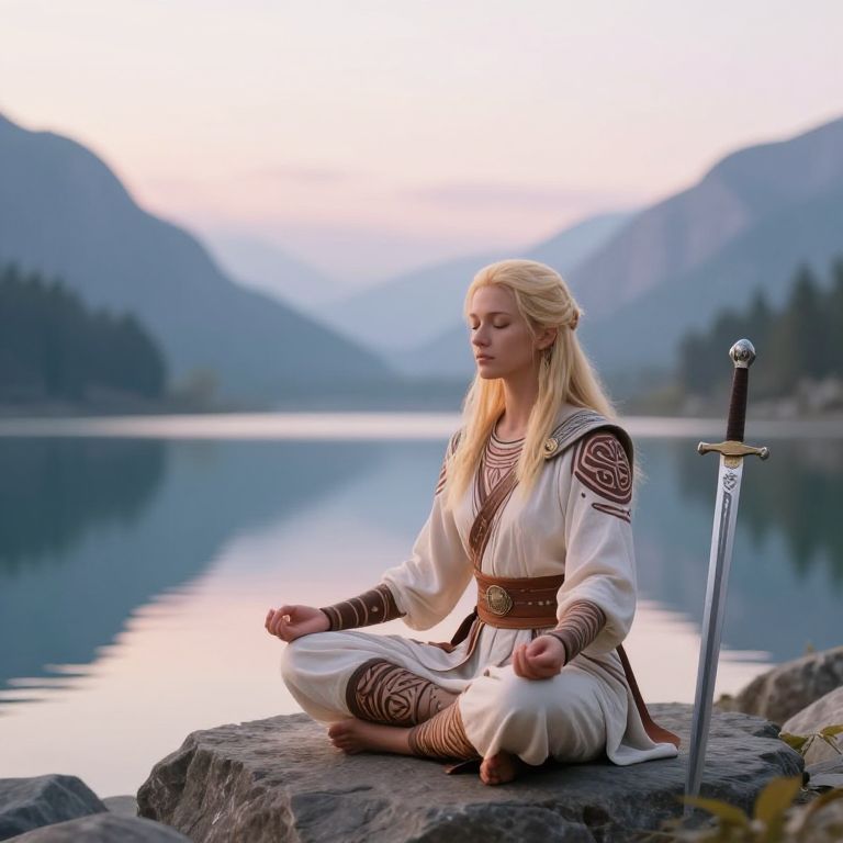 Photograph of a blonde woman with fair skin, sitting cross-legged on a rock by a serene, reflective lake surrounded by misty mountains and pine trees. She wears a white, medieval-style tunic with brown Celtic knot patterns, a brown belt, and brown leggings. Her eyes are closed, and she appears calm, meditating with her hands in a relaxed position. A silver sword with a black hilt is planted in the rock to her right. The soft, pastel-colored sky adds a peaceful ambiance to the scene. The image has a slightly fantasy-like, digitally enhanced quality.