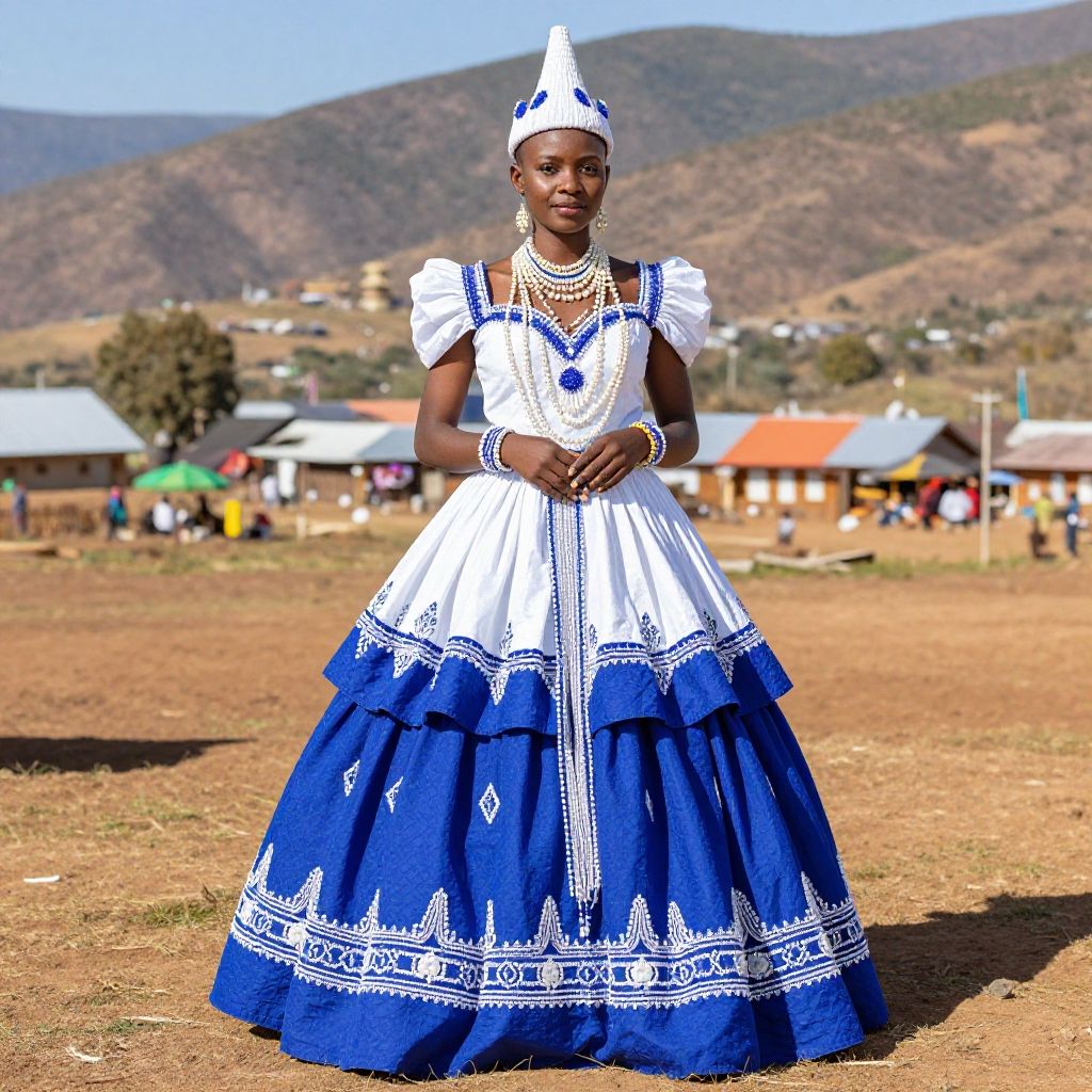 Modern traditional Basotho wedding dress blending vibrant royal blue and white fabrics with intricate handmade beadwork, layered pleats, and a majestic conical hat, set against a sunlit rural mountain village backdrop, celebrating culture and elegance.