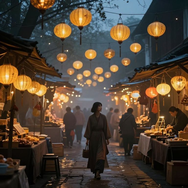 In a misty twilight market alive with flickering lanterns and the faint hum of commerce, a solitary figure stands amidst the weightless dance of golden lights, embodying the transient beauty of desire and loss, where dreams materialize and vanish like whispers in the night.