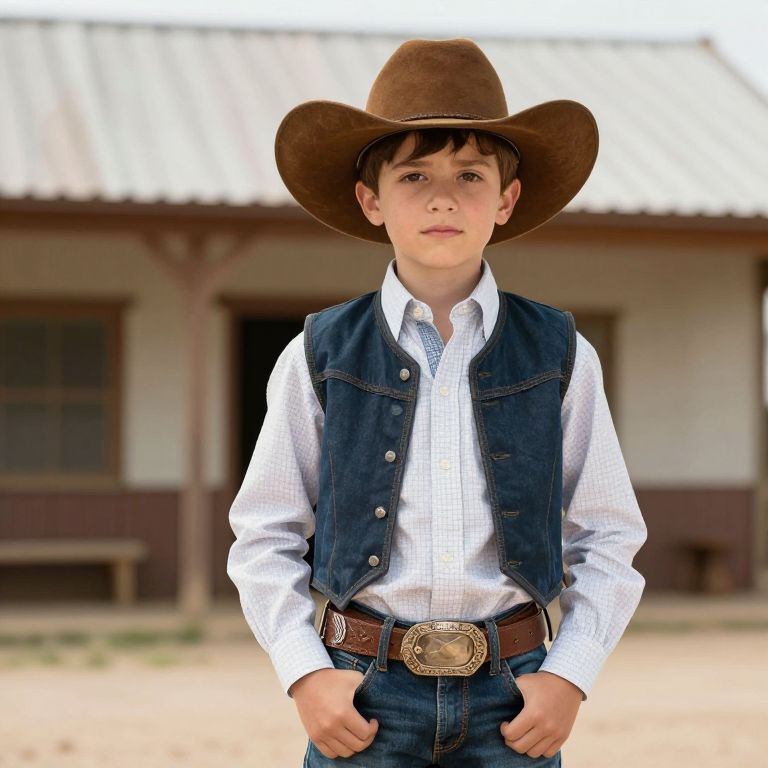 Photograph of a young boy in a brown cowboy hat, white shirt, denim vest, and belt, standing in front of a rustic building.