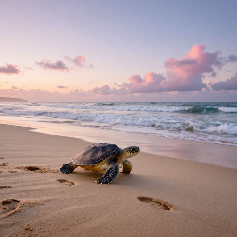 Turtle walking slowly across a sandy beach at sunrise, footprints trailing behind, pastel colored sky with soft clouds, ocean waves gently rolling in, serene and peaceful atmosphere, detailed natural textures and realistic lighting.