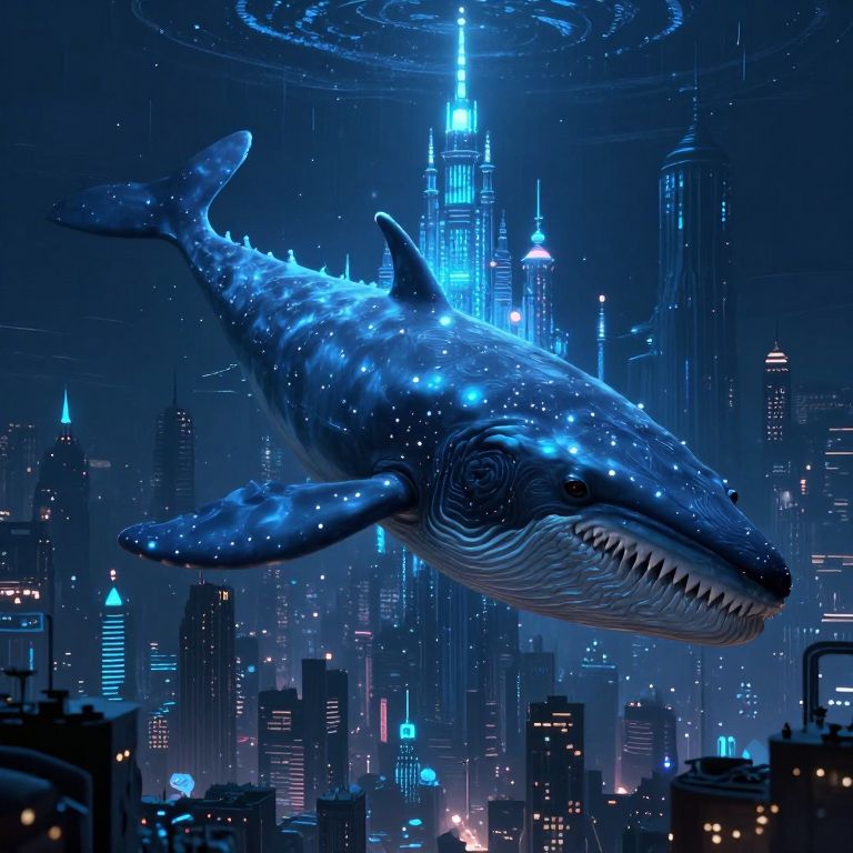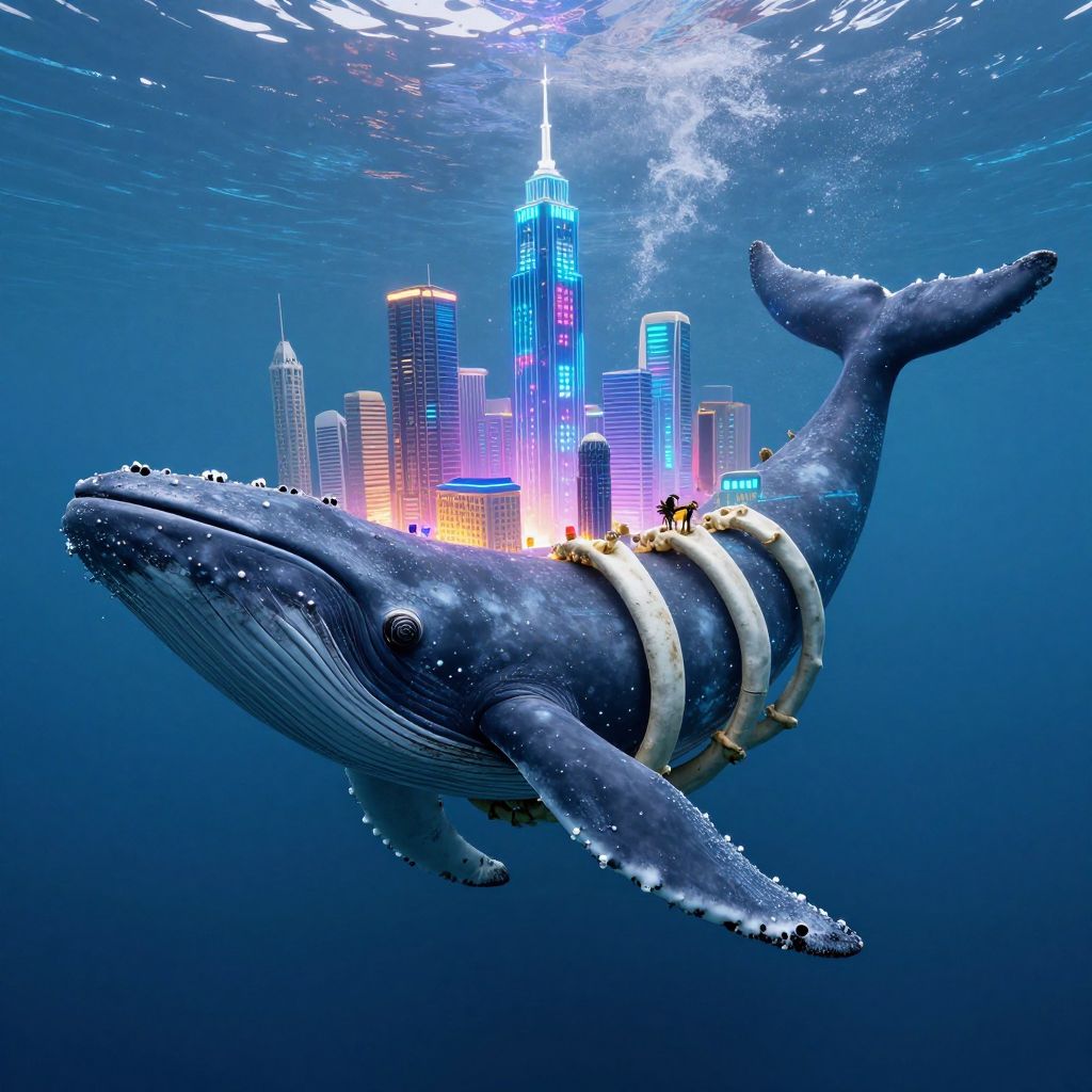 An otherworldly 3D-rendered scene depicts a surreal cityscape perched atop the backs of massive whales gracefully swimming beneath the surface, blending high-definition realism with imaginative fantasy as the whales' slow, rhythmic fins create a mesmerizing interplay of light and shadow, evoking a dreamlike, cyberpunk-inspired vision where urban architecture and marine life coexist in perfect harmony.