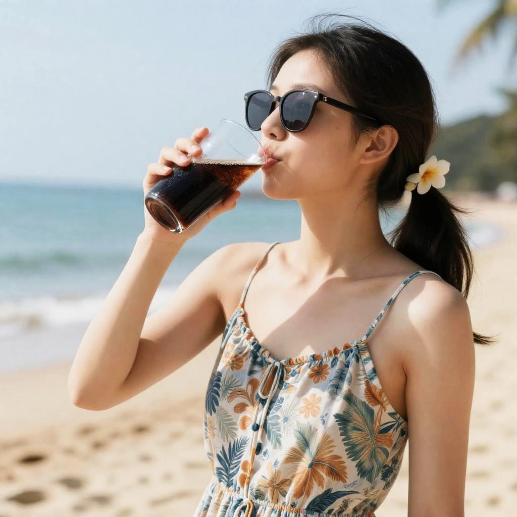 A young Asian woman wearing sunglasses and a floral summer dress is drinking soda from a glass while standing on a sandy beach. She has a flower accessory in her ponytail and a calm ocean background under a clear sky.