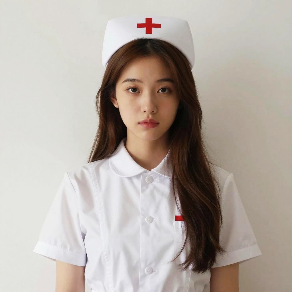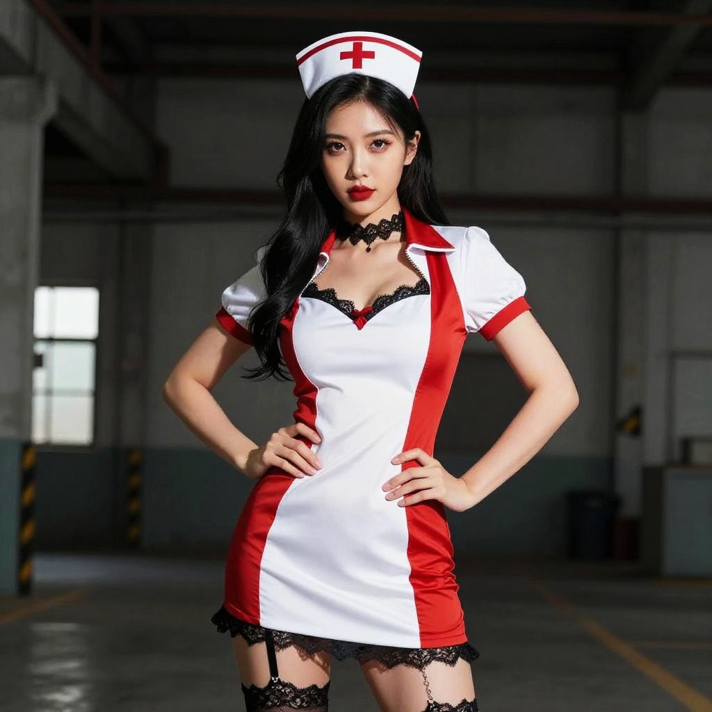 A confident woman dressed in a stylized nurse costume poses in an industrial warehouse setting. The outfit features a white and red theme with black lace accents, creating a provocative and edgy look against the stark background.
