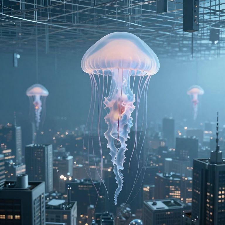 Giant jellyfish float silently above an inverted city, their tendrils tapping away at keyboard-like lattices to control clouds like thoughtless constructs.