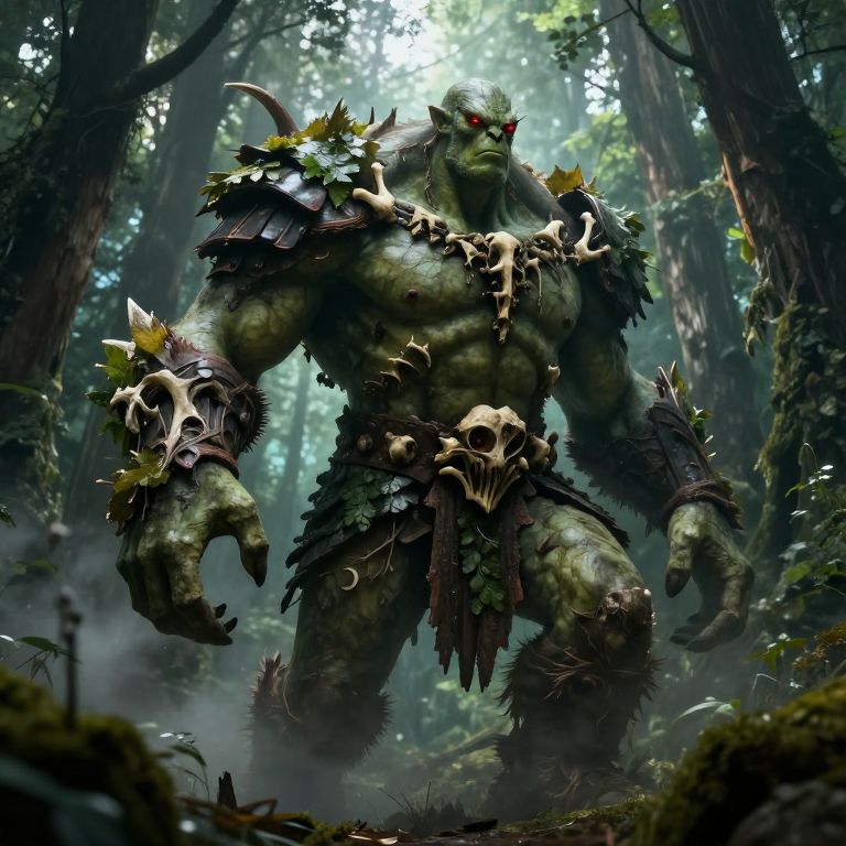 Muscular ogre standing in a dense enchanted forest with green skin and glowing red eyes. The figure is adorned with rugged armor made of bones and leaves, surrounded by swirling mist. The scene features dramatic lighting and a highly detailed fantasy environment.