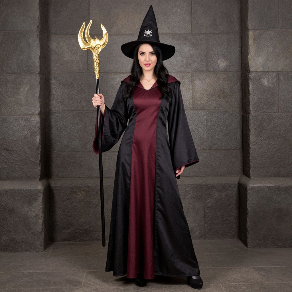Photograph of a woman with fair skin and dark hair wearing a black witch hat adorned with a white pentagram. She is dressed in a long, black, satin robe over a deep burgundy dress. She holds a golden, trident-like staff in her right hand. The background is a dark, stone wall with a textured, grey surface. The woman stands confidently in the center, with a serious expression and red lipstick. The lighting is even, highlighting her figure and attire against the dark background. The overall style is gothic and mystical.