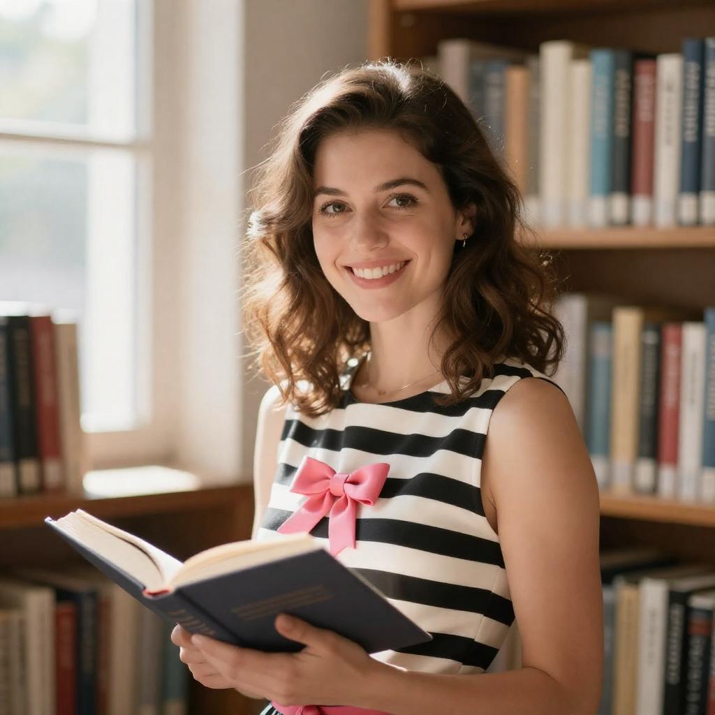 Photograph of a smiling woman with wavy brown hair and glasses, wearing a white shirt and navy vest, holding a book titled "The Secret History of Us." Christmas tree with red and blue ornaments in the background. Wooden bookshelf with books in the right. She is in a cozy, festive setting, looking slightly to the left.