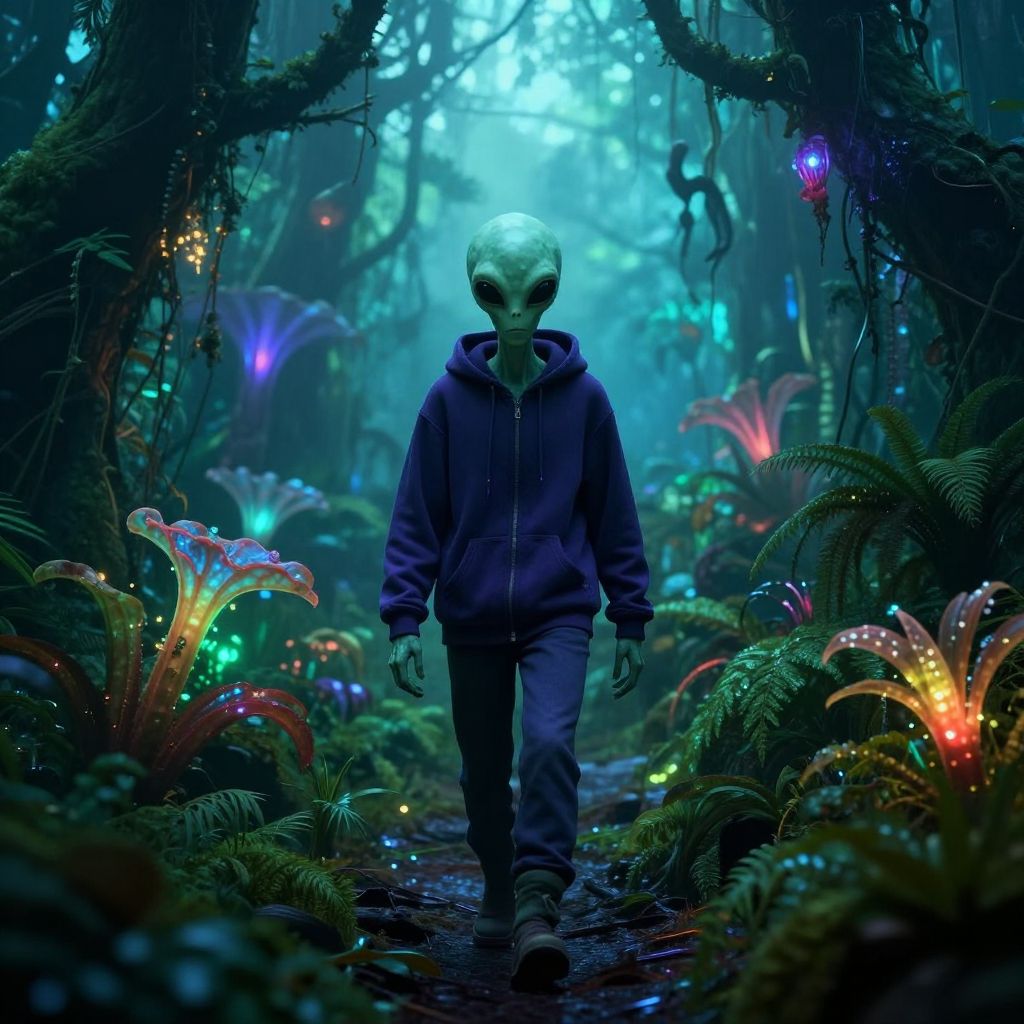 Alien wearing hoodie walking through a dense alien jungle, bioluminescent plants illuminating the scene, foggy atmosphere, high detail and vibrant palette
