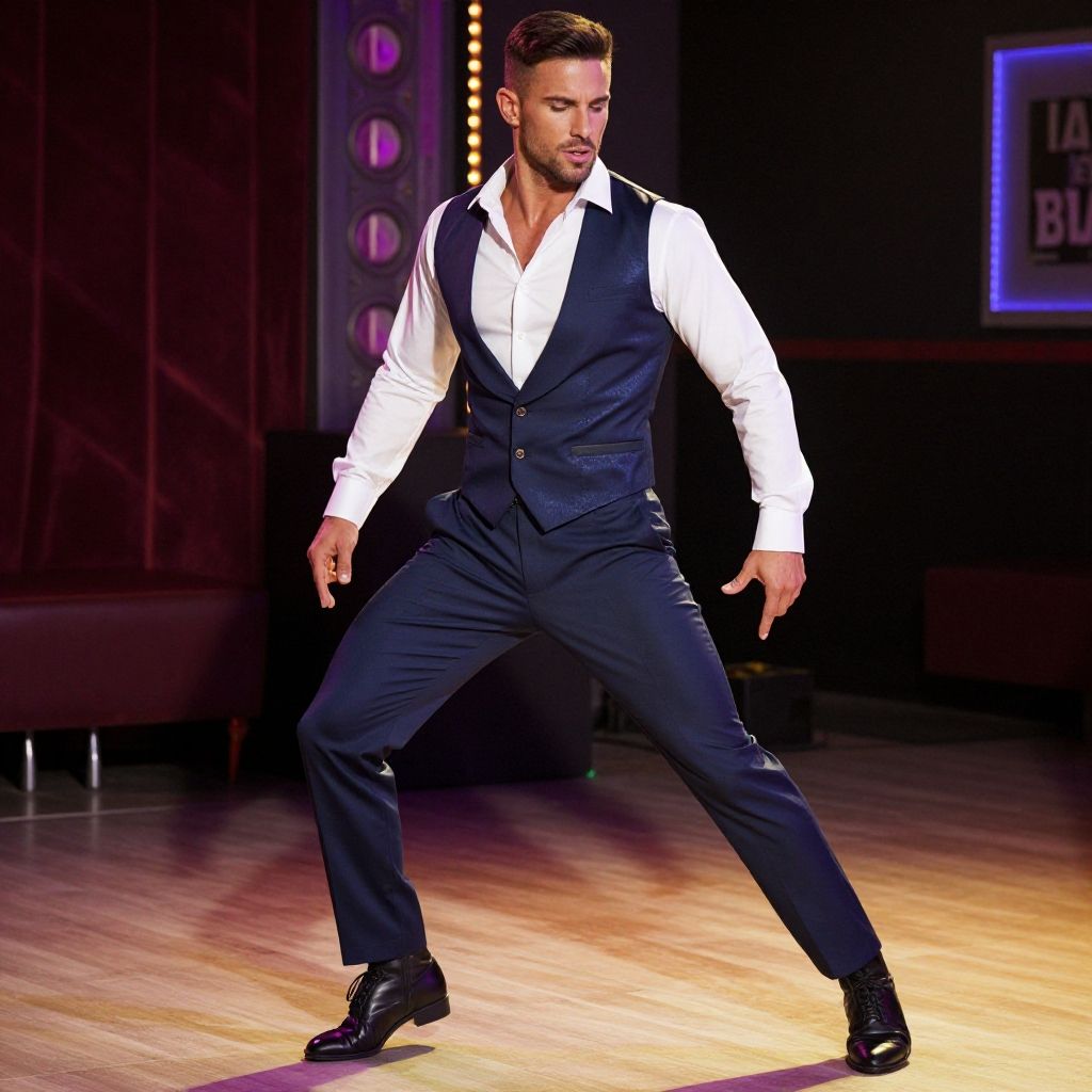 Photograph of a confident, handsome man with a well-groomed beard and short, dark brown hair, dancing on a wooden stage. He wears a white dress shirt with the top button undone, a dark blue vest, matching blue trousers, and polished black dress shoes. His stance is wide and dynamic, with one leg forward and arms slightly bent. The background is dimly lit with purple and black hues, featuring a framed picture and circular light patterns on the wall. The stage lighting highlights his outfit and dance posture, creating a dramatic and focused atmosphere.