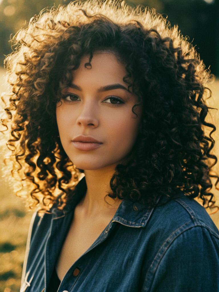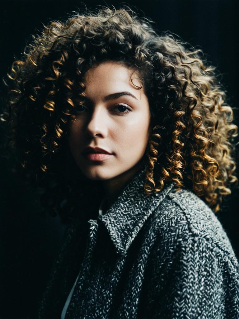 Woman with Curly Hair, cinematic realism, stylish natural portrait