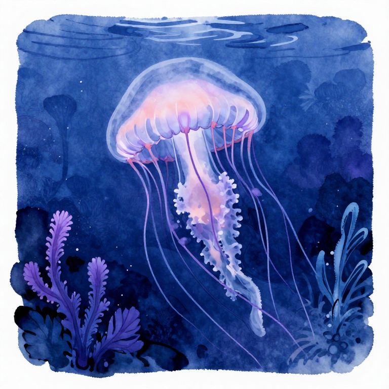 Watercolor illustration of a glowing, translucent jellyfish with pink and blue hues, surrounded by dark blue underwater plants and ripples.