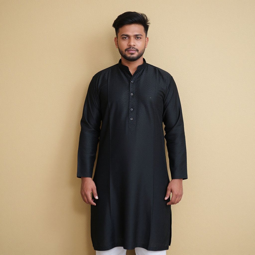 "Traditional Black Kurta, a man in a black shirt standing in front of a wall"