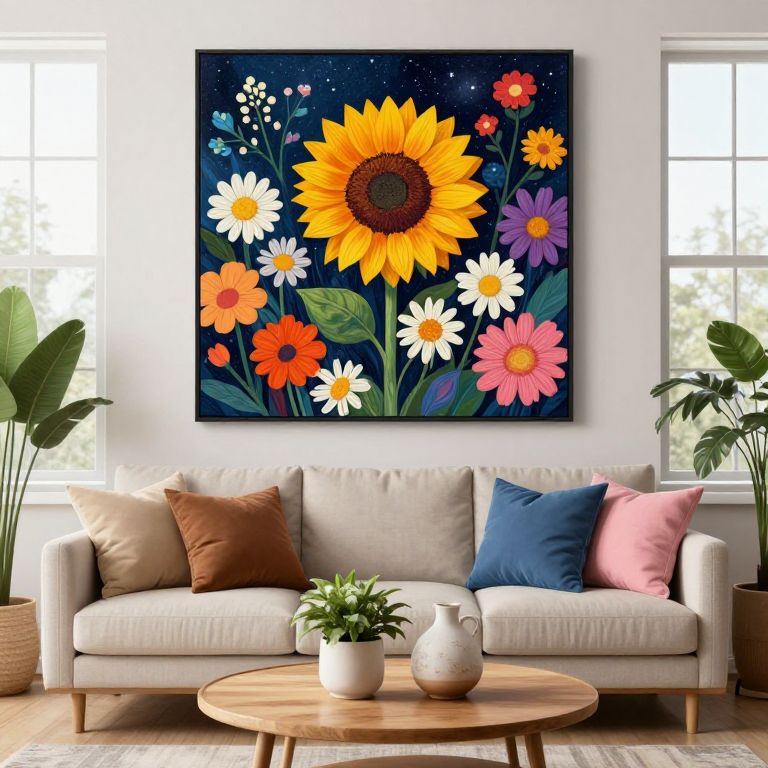 Vibrant floral artwork featuring a sunflower, daisy, and other colorful blooms against a starry night sky hangs above a cozy living room sofa adorned with six pillows in shades of beige, brown, blue, and pink, complemented by a round wooden coffee table with a potted plant and ceramic vase, flanked by two green leafy plants near large windows.