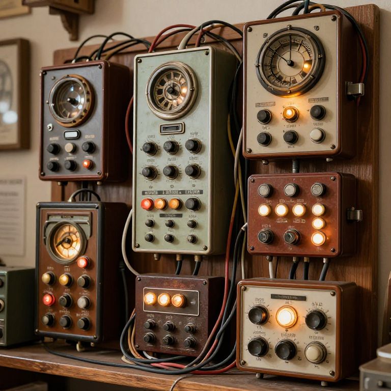 Laminated super cute 1950s switchboards kitschy analog and blinking lights and buttons, crowded, lots of wires, complicated,
