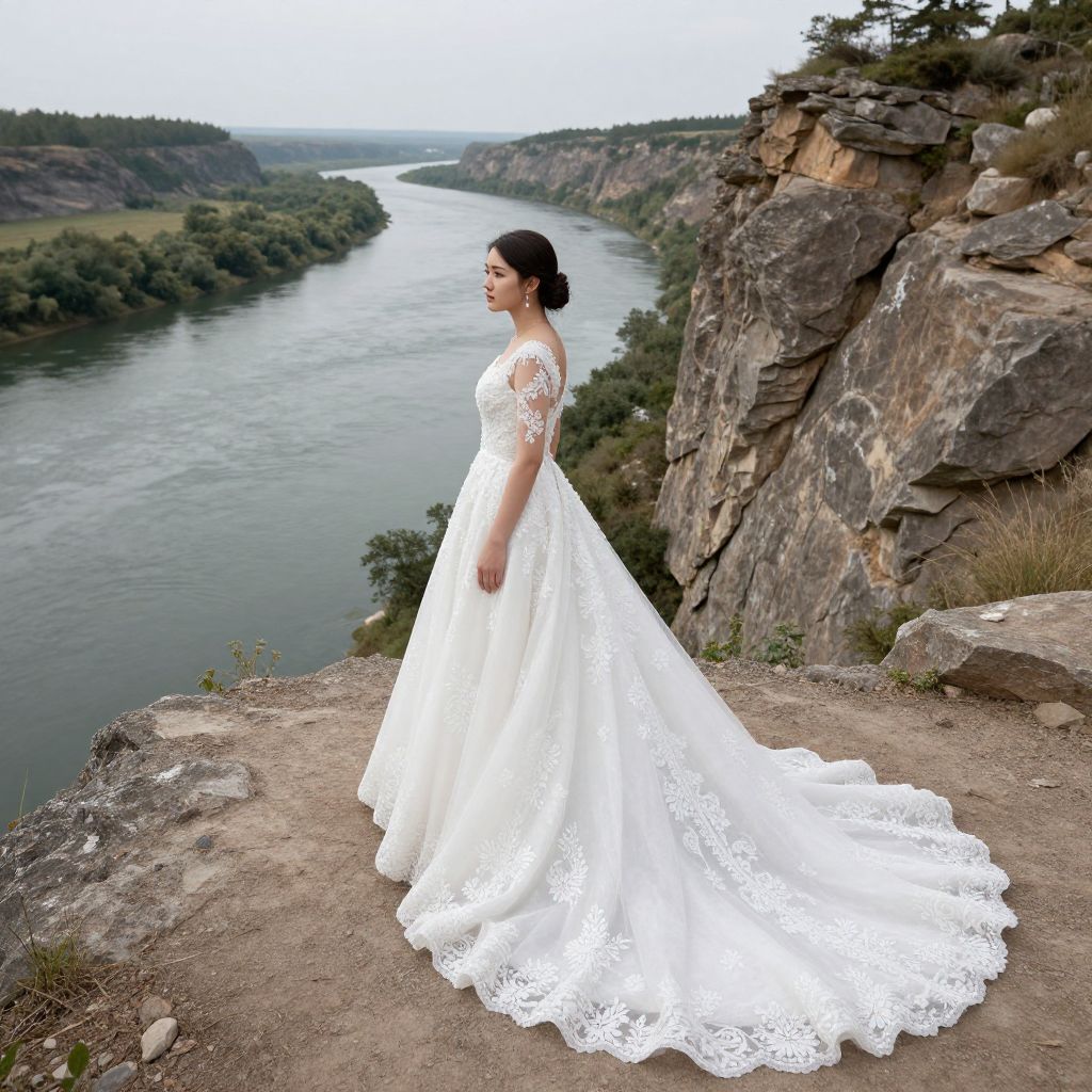 Photograph of a dark-haired woman with fair skin wearing an elegant, white lace wedding dress with short sleeves and a full, flowing skirt. She stands on a rocky cliff overlooking a serene, winding river surrounded by rugged, forested cliffs. The dress features intricate lace patterns and a delicate, scalloped hem. The background includes a clear blue sky and distant hills. The woman has a calm, confident expression, and her hair is styled in loose waves. The natural light highlights the texture of the lace and the rocky terrain. The overall composition blends natural beauty with bridal elegance.