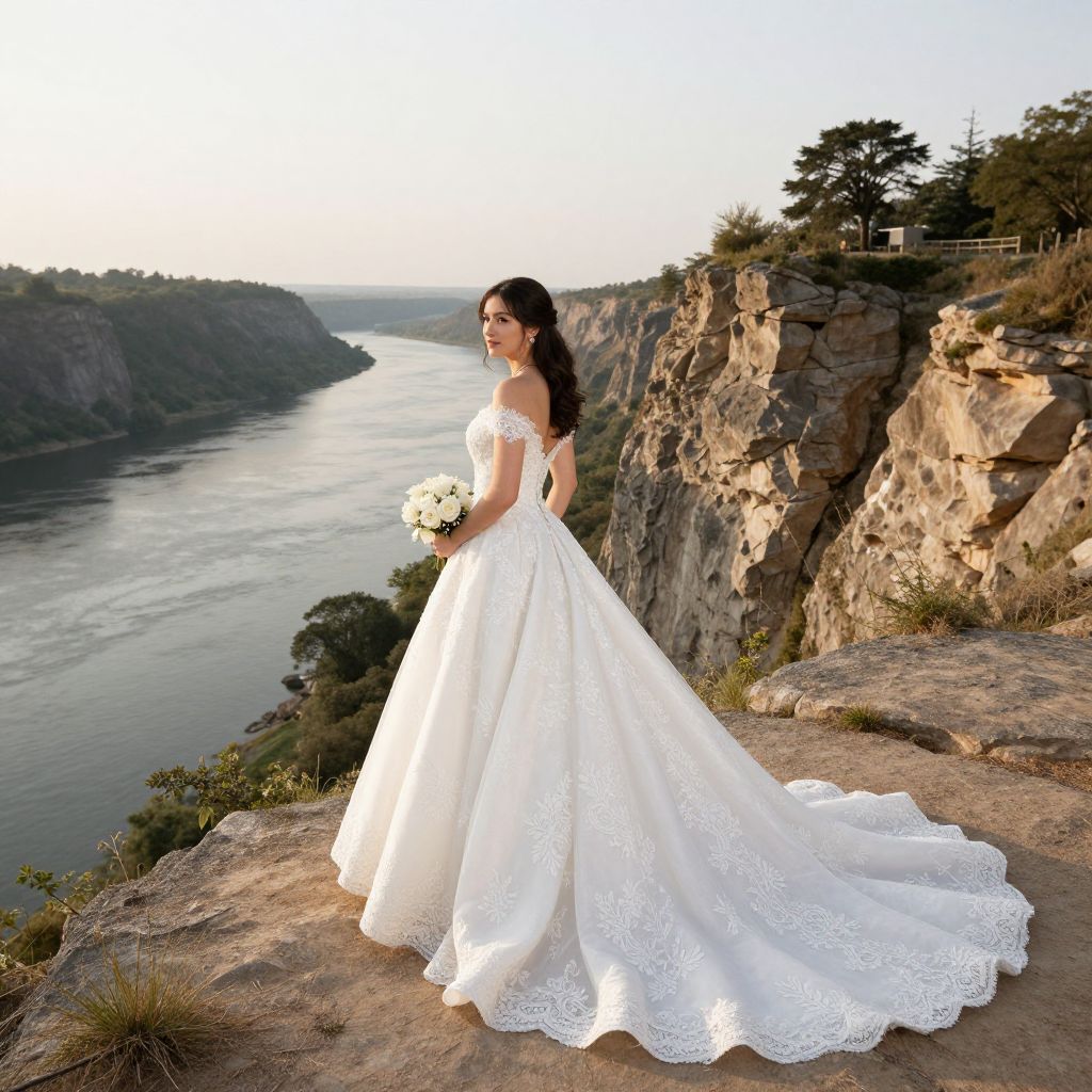 Photograph of a brunette woman with long hair in a white lace wedding dress standing on a rocky cliff overlooking a river and canyon landscape.