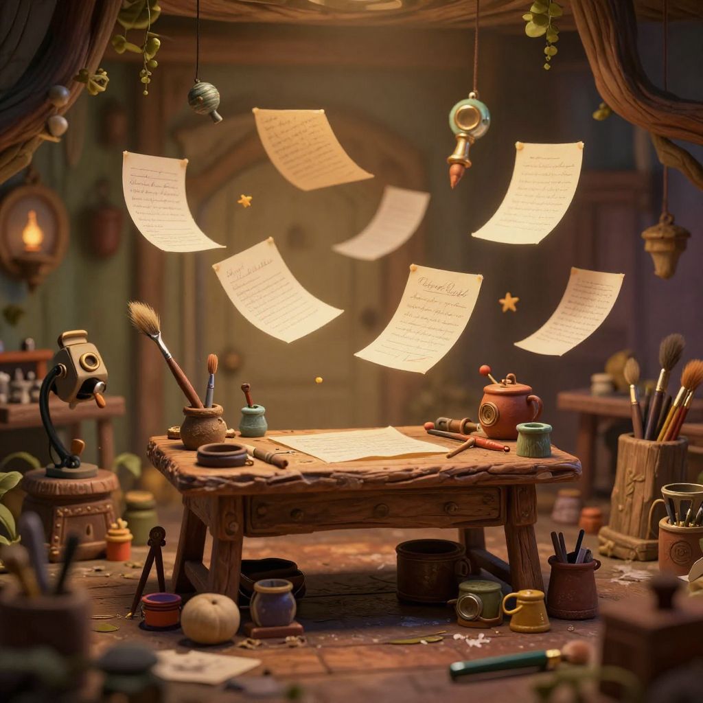 Whimsical clip art generator environment with a fairy-tale workshop filled with tiny art tools, brushes, and paper sheets floating mid-air, warm lighting and rich textures, fantastical cartoon atmosphere, inviting creative inspiration