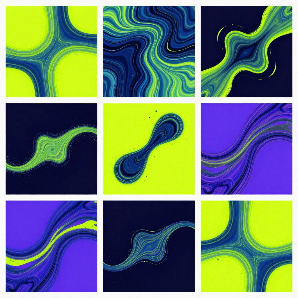AI picture mixer generating abstract art with flowing shapes and fluid motion, bright neon palettes, seamless blending of photos and digital paint strokes, dynamic patterns evoking energy and creativity, modern graphic design style, high detail and contrast.