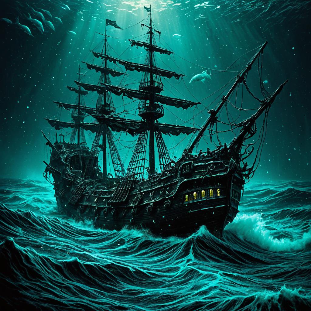 Masterpiece, best quality, detailed, a sunken ghost galleon shrouded in phosphorescent deep sea, with swirling bioluminescent plankton and jagged coral. Haunting and mysterious, waves lapping in the high seas, conveying an air of mystery and unease.
