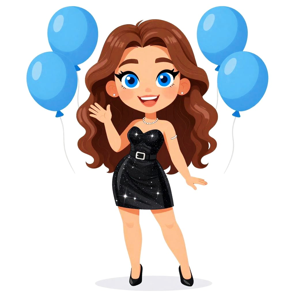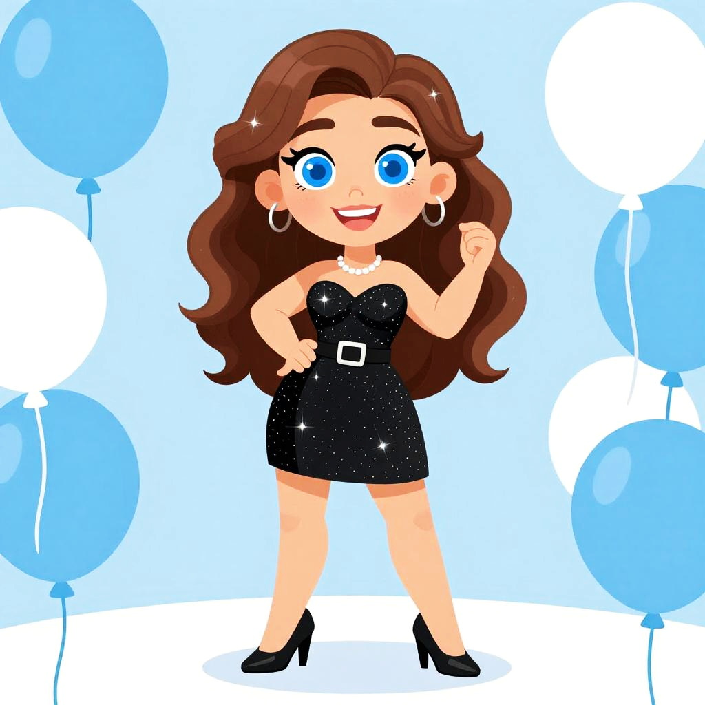 This is a colorful digital cartoon-style drawing of a smiling woman with long, wavy brown hair and bright blue eyes. She's wearing a sparkly black strapless dress with a belt and black heels. Her pose is playful, with one hand up and the other down. Blue balloons float behind her on a white background, adding a festive feel.