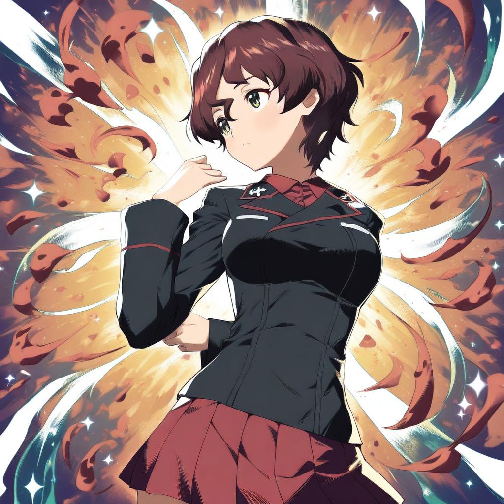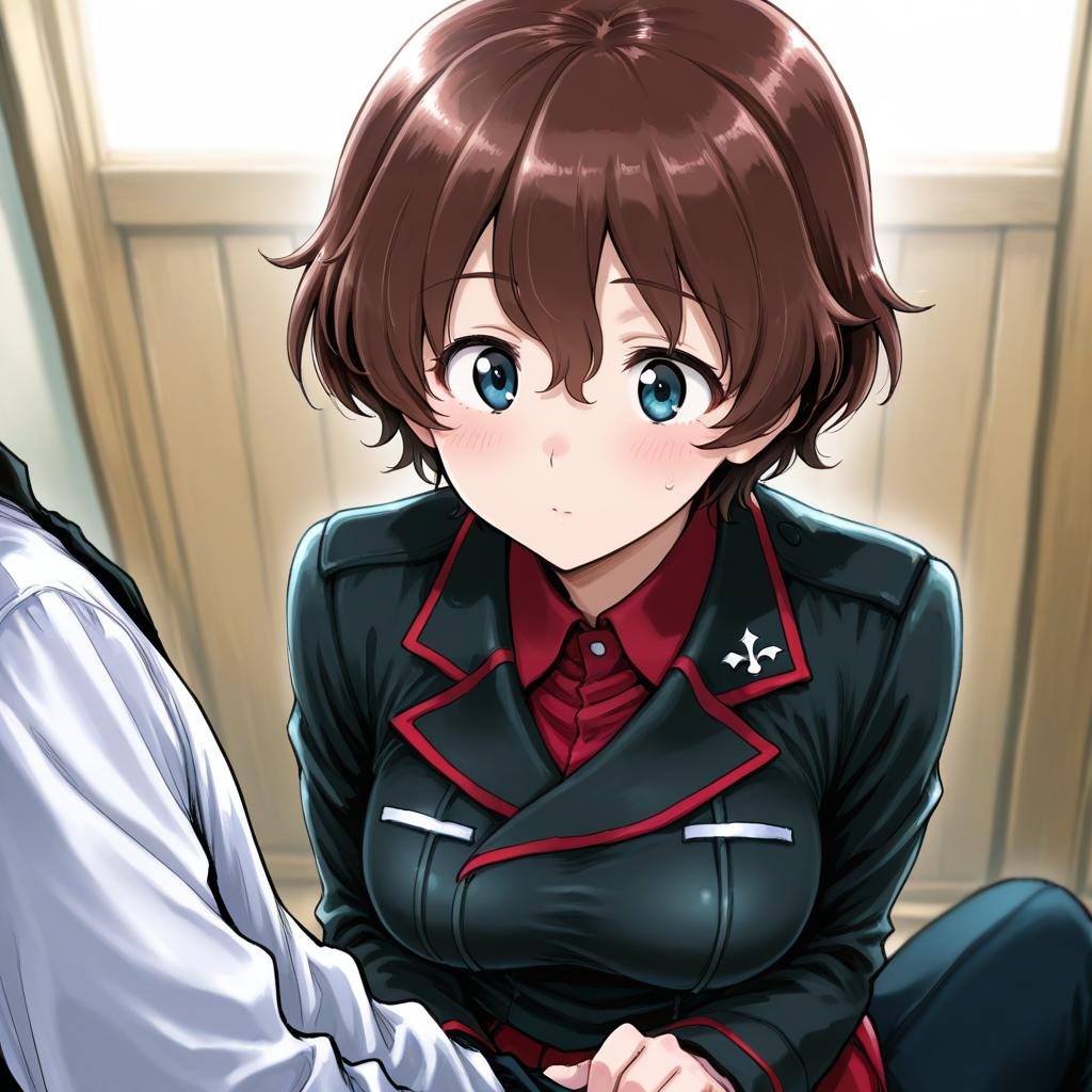 Akaboshi koume, girls und panzer, 1girl, blue eyes, short hair, brown hair, wavy hair, medium breasts, kuromorimine military uniform, long sleeves, by artist gofu, leet