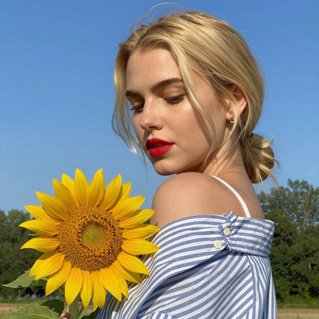 Photograph of a blonde woman with fair skin, wearing a blue and white striped shirt, partially off her shoulder, holding a bright yellow sunflower. She gazes downward with red lipstick, against a clear blue sky and green trees in the background. Her hair is loosely tied back, and she wears small earrings.