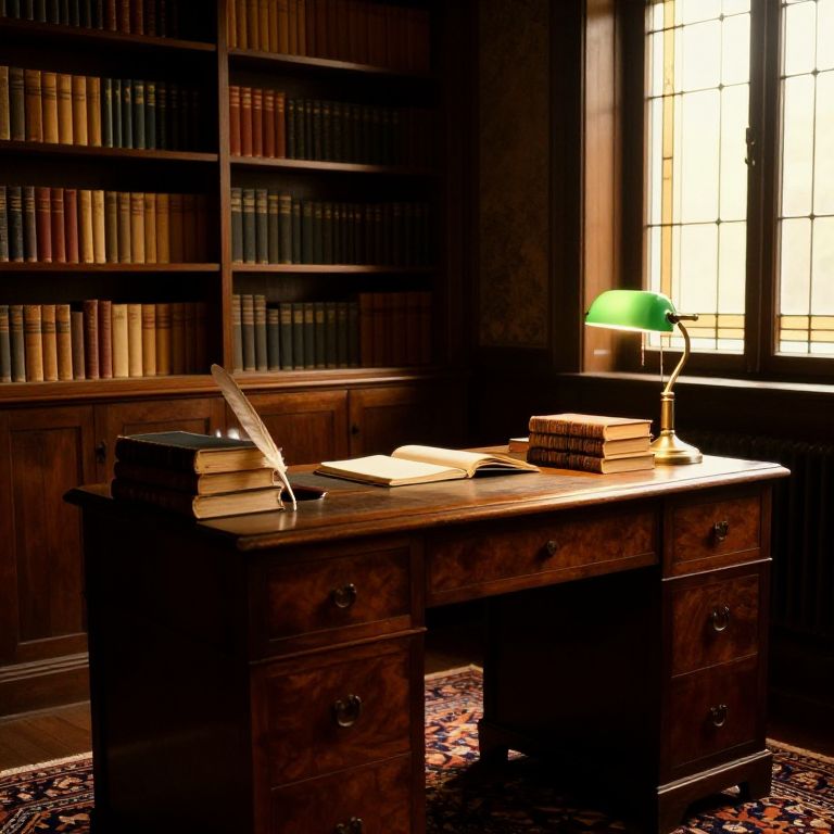 Photograph of a dimly lit, vintage study with a wooden desk in the foreground. The desk holds several stacked books, a closed book with an open bookmark, and a green-shaded desk lamp. In the background, tall bookshelves filled with colored books line the wall, and a window with stained glass allows soft, warm light to filter in. The desk has dark wood with brass handles, and a patterned rug is partially visible beneath it. The overall ambiance is warm, scholarly, and nostalgic.