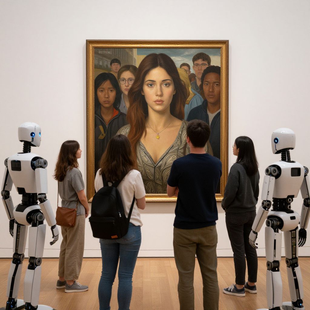 A crowd of robots gather in an art gallery to admire a hyper-detailed painting of a woman in a crowd.